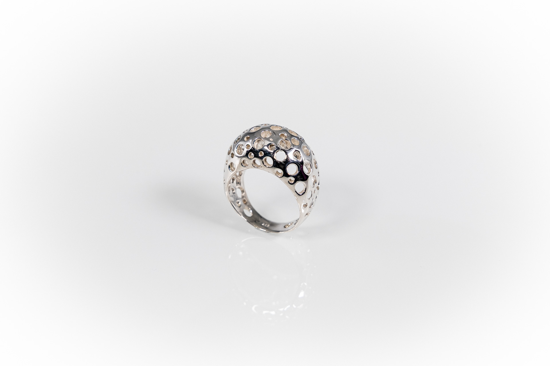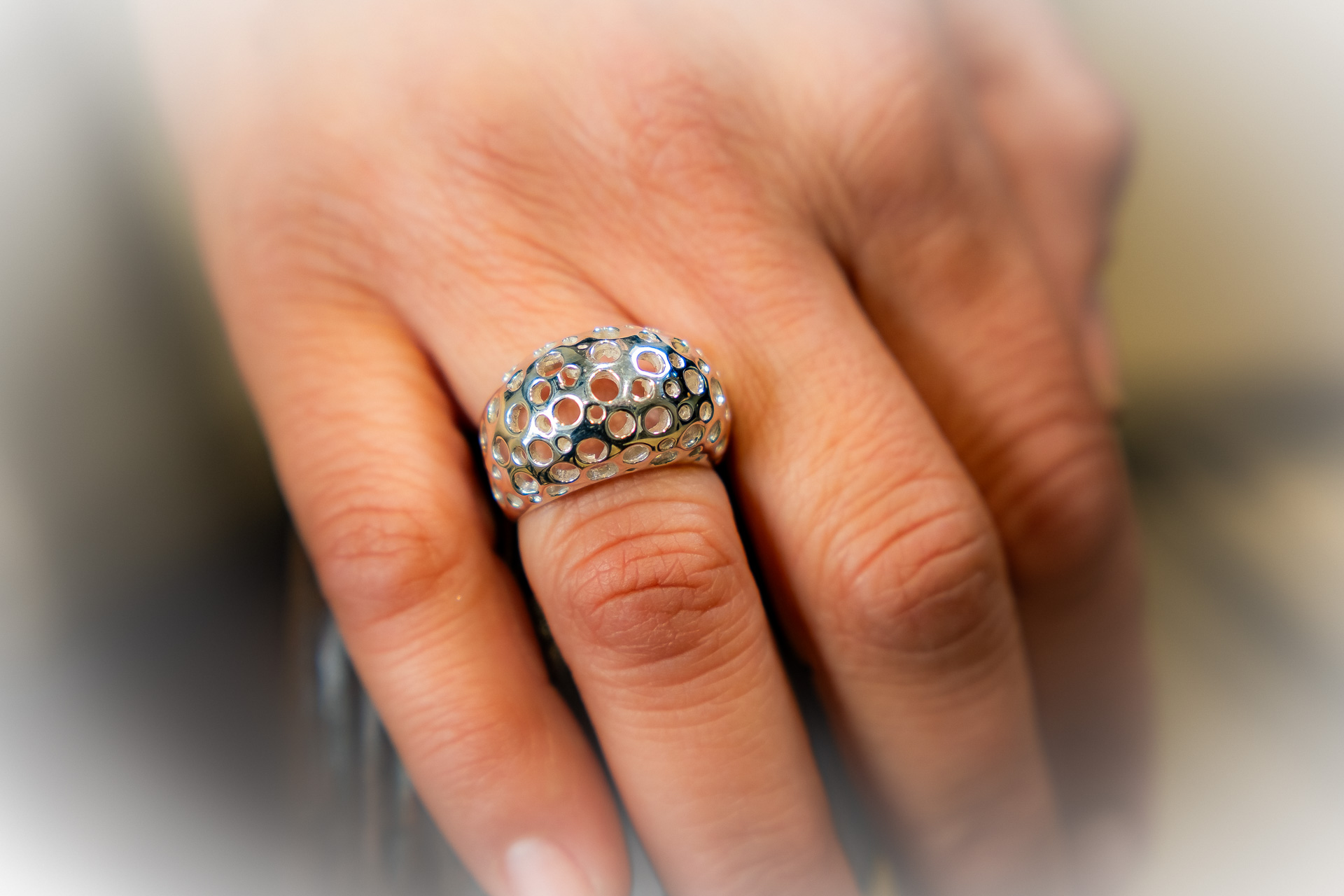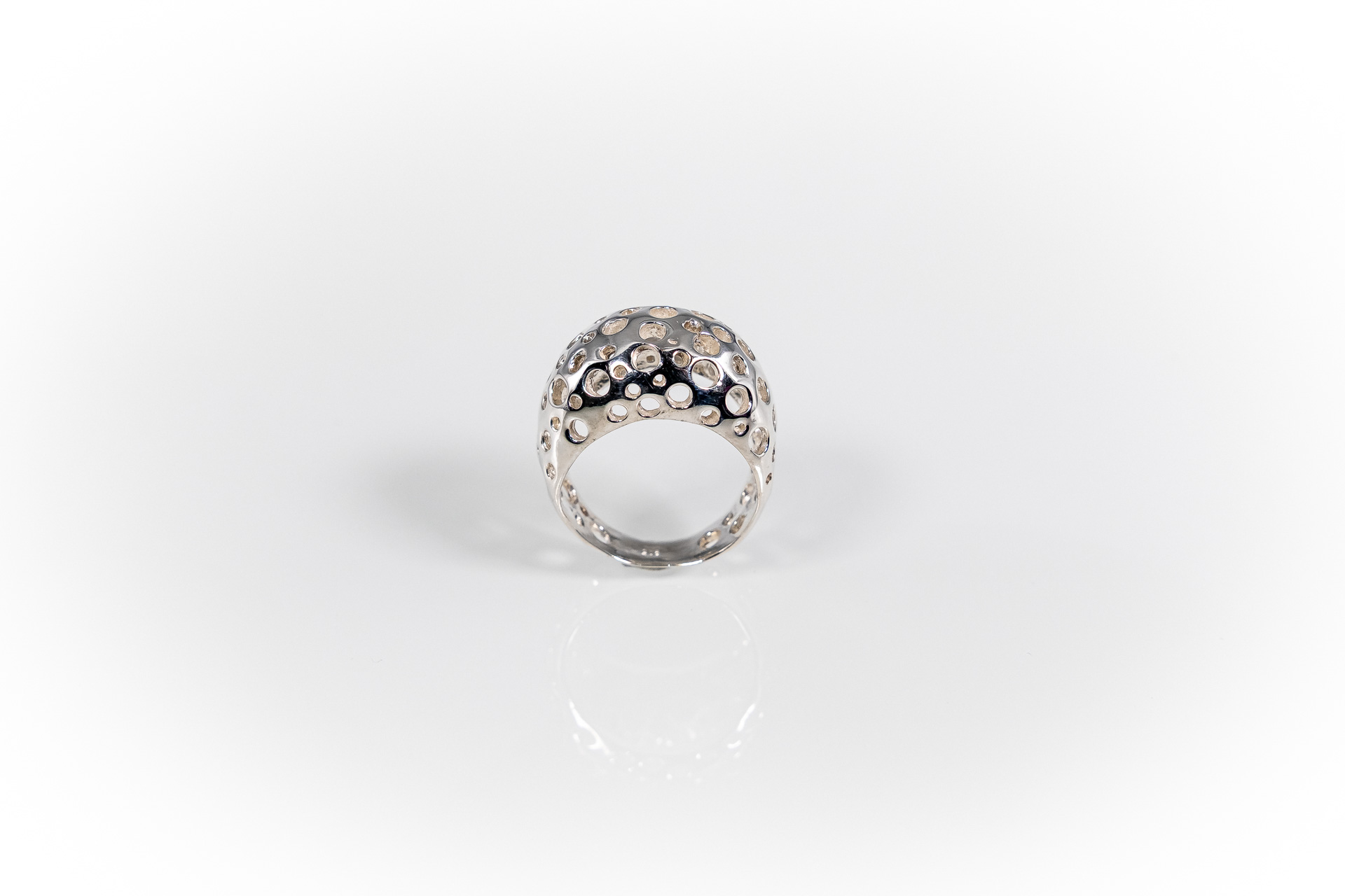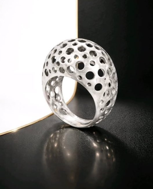 Chunky & Minimal δαχτυλίδι με οργανική φόρμα και στρογγυλές οπές που αιχμαλωτίζουν τα βλέμματα και το φως.