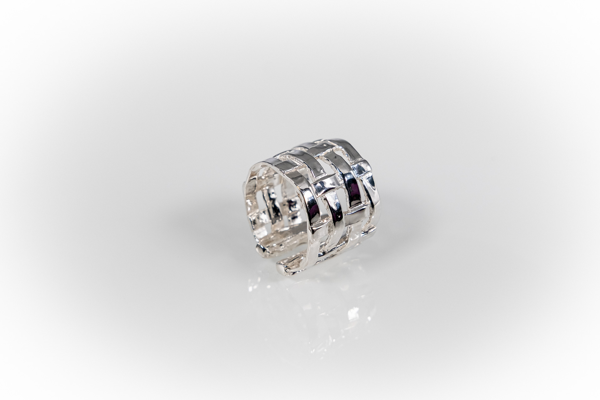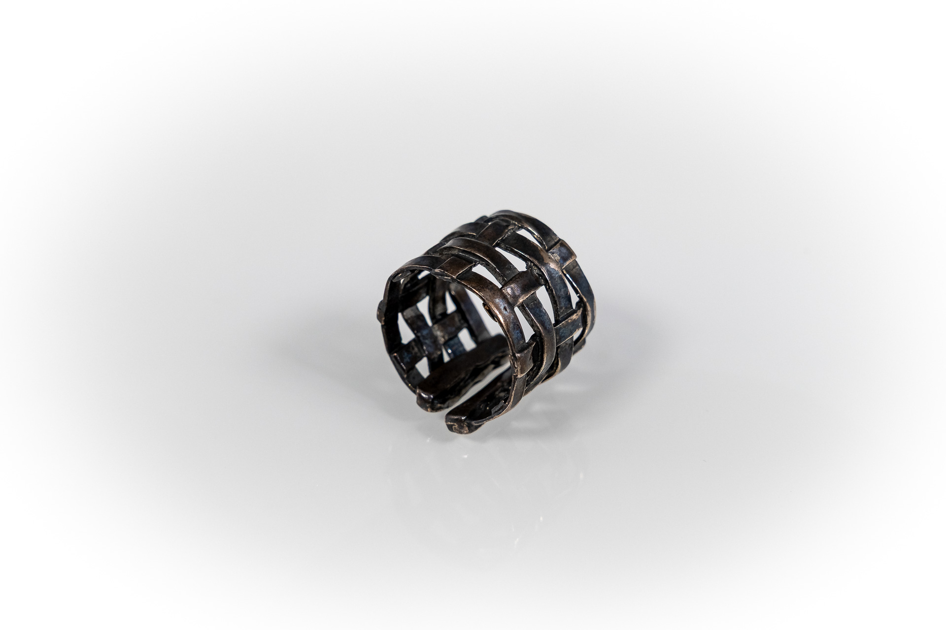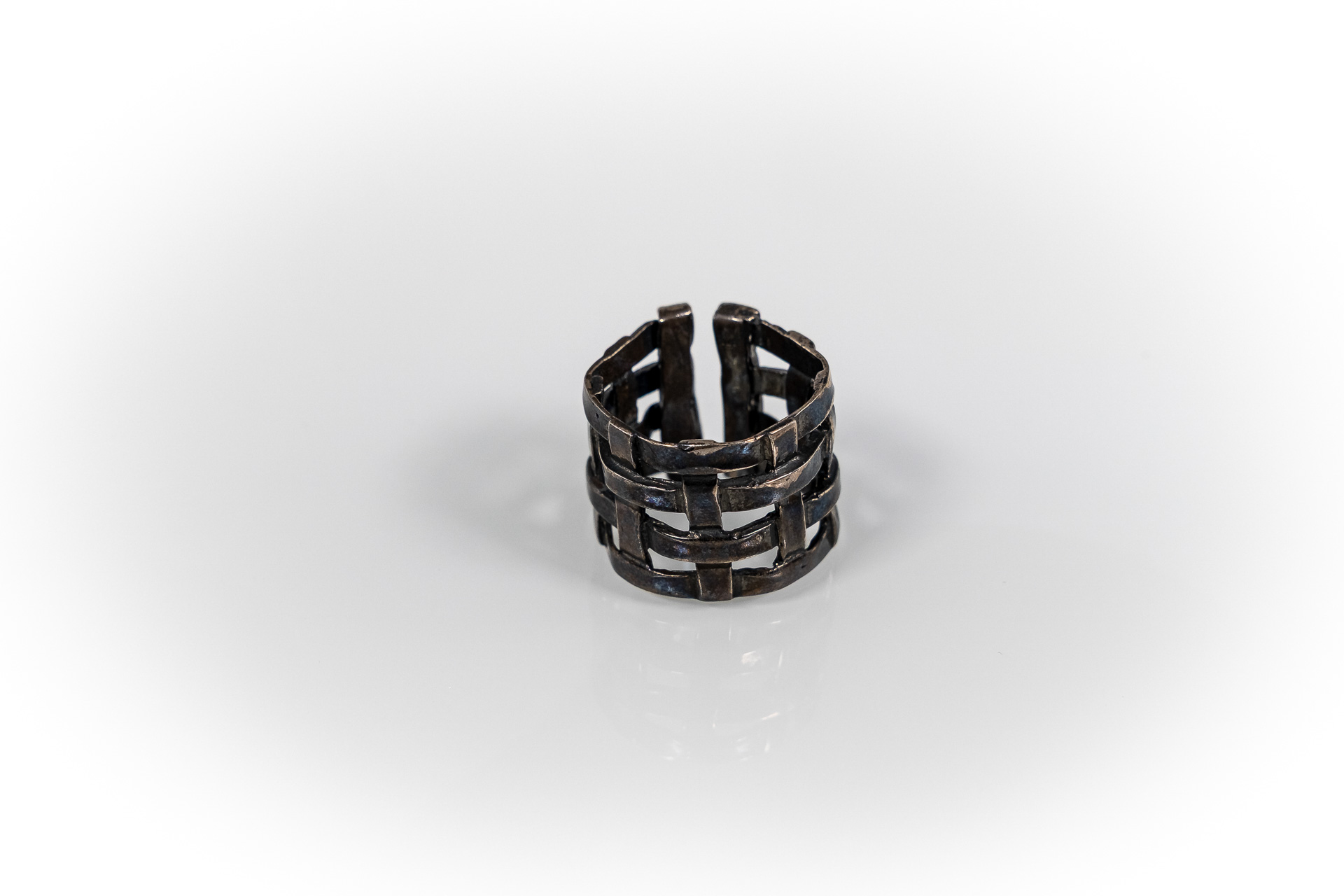 Πλεκτό, ιδιαίτερο σχεδιαστικά, δαχτυλίδι με έμφαση στις υφές του και μεγάλες αναφορές στο Μεσαίωνα και τη φύση.