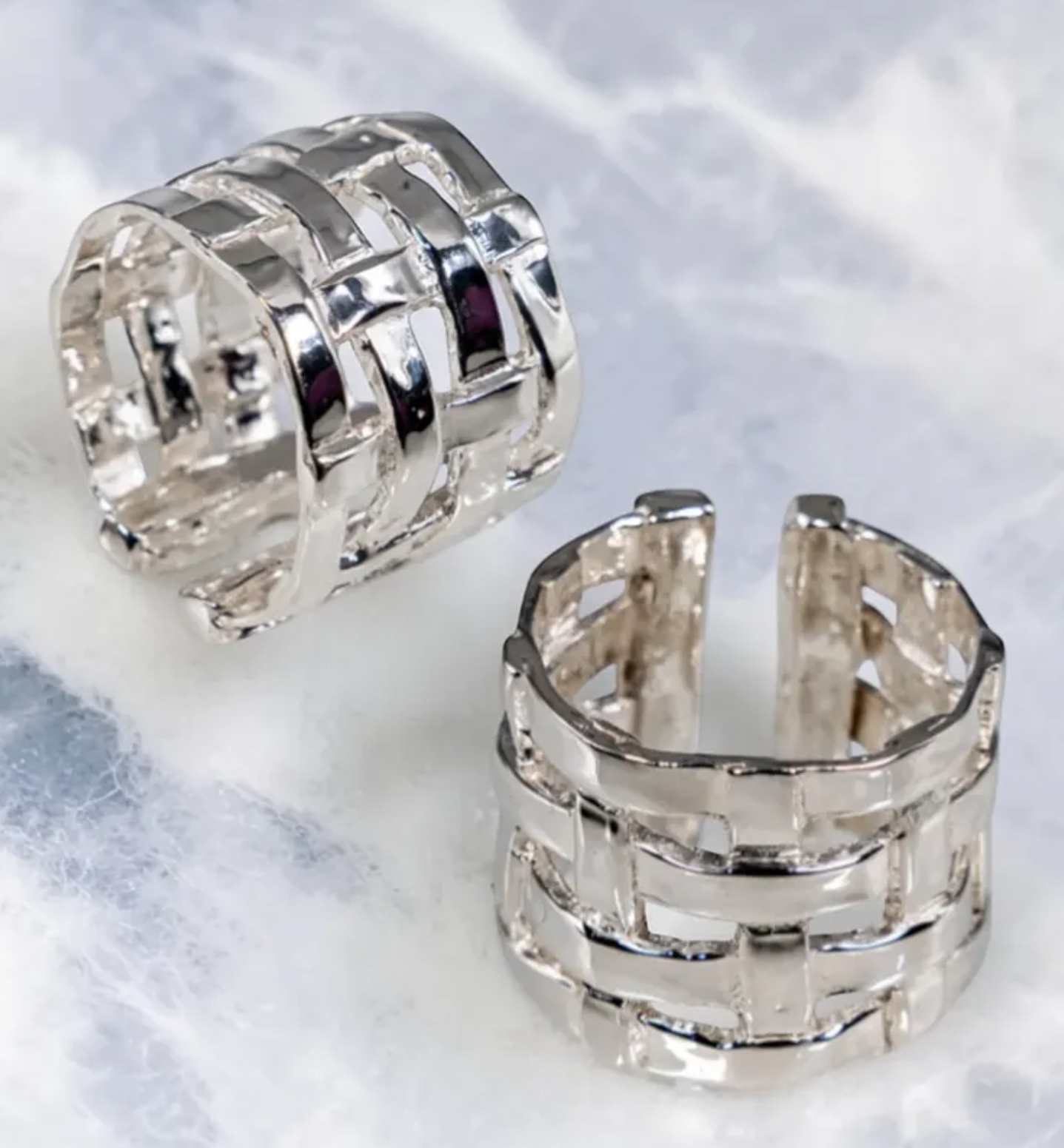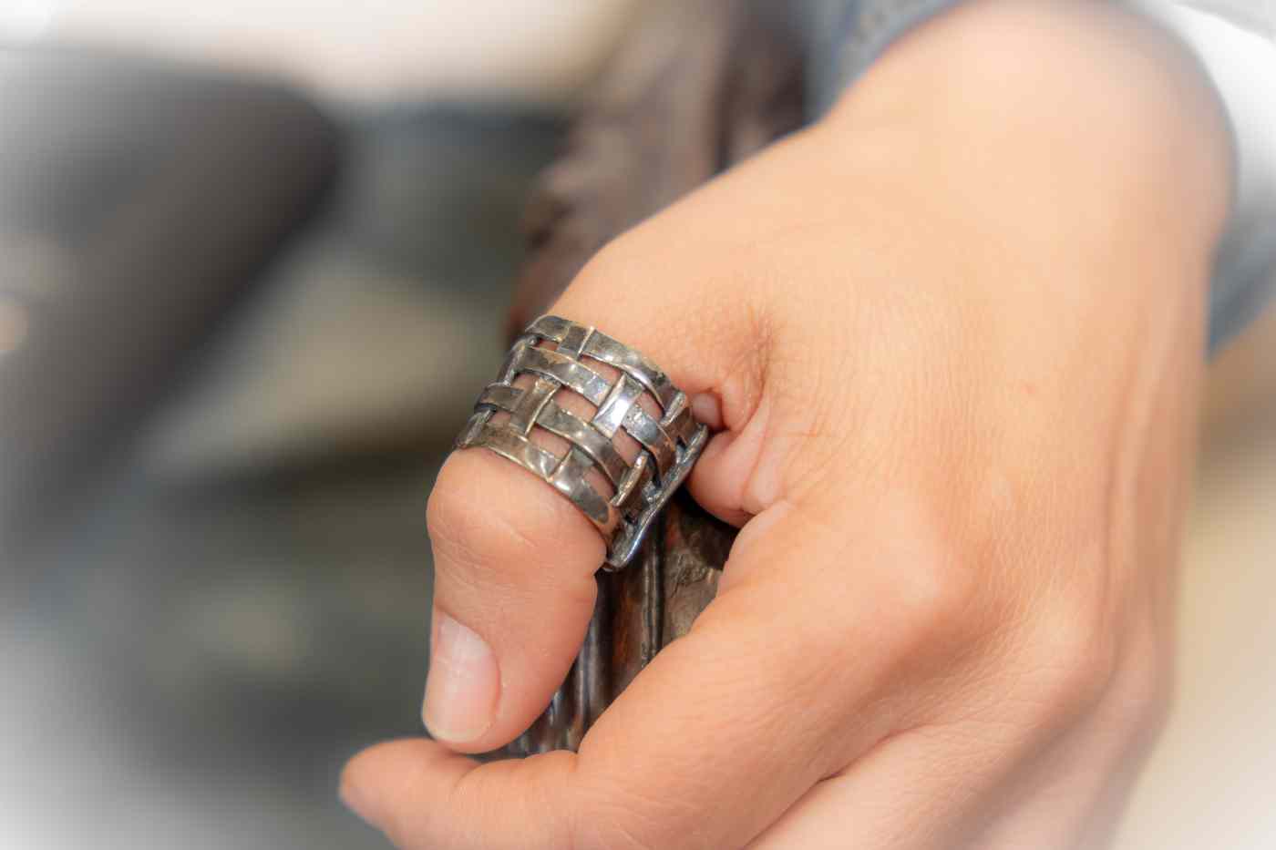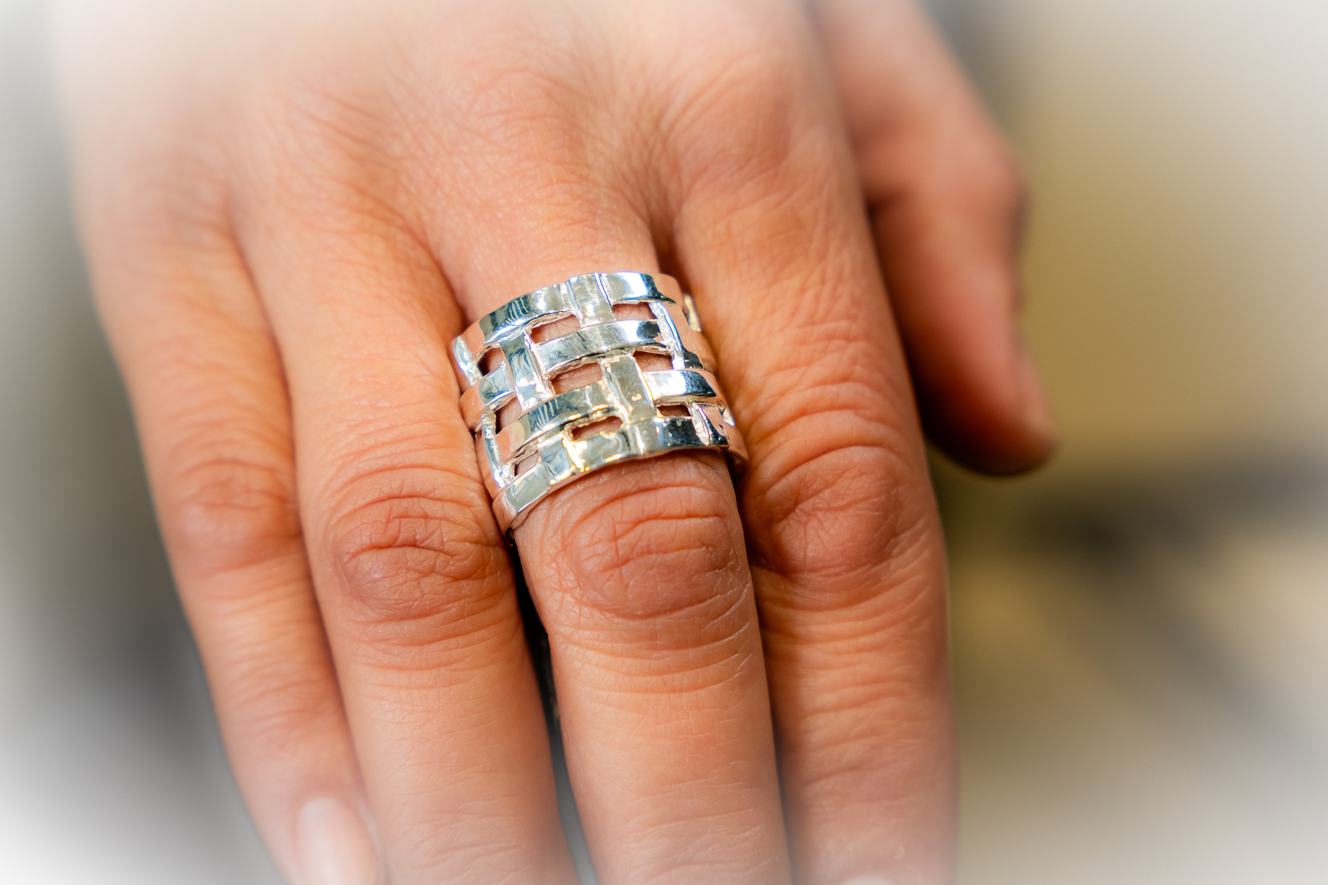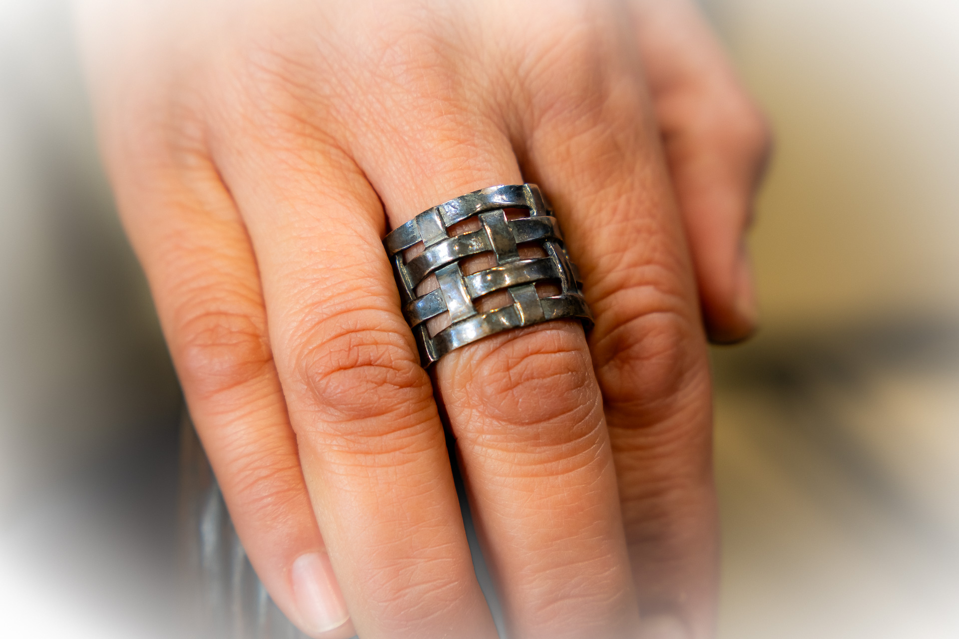 Πλεκτό, ιδιαίτερο σχεδιαστικά, δαχτυλίδι με έμφαση στις υφές του και μεγάλες αναφορές στο Μεσαίωνα και τη φύση.
