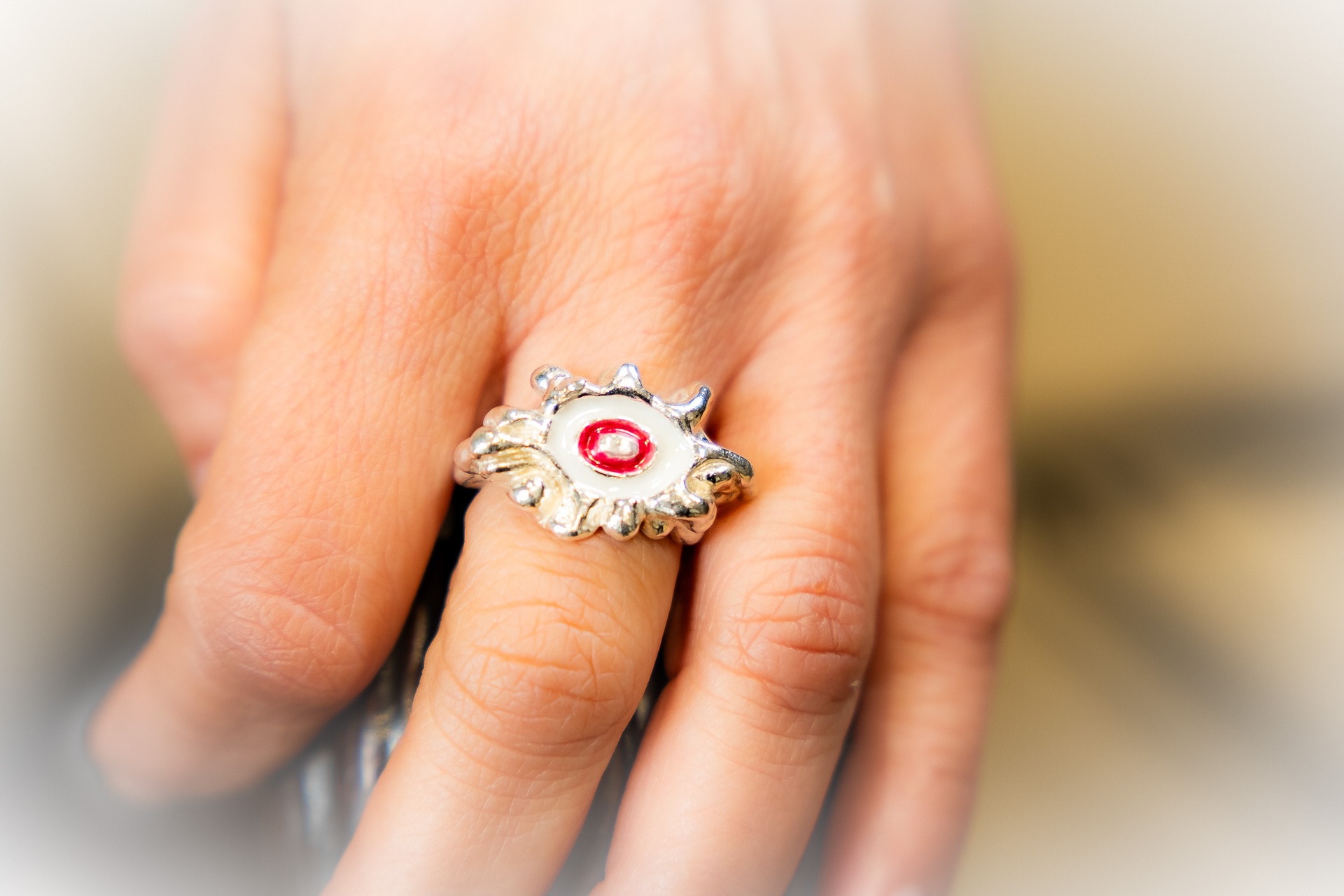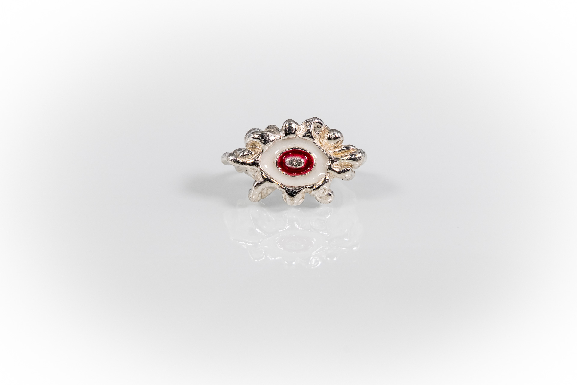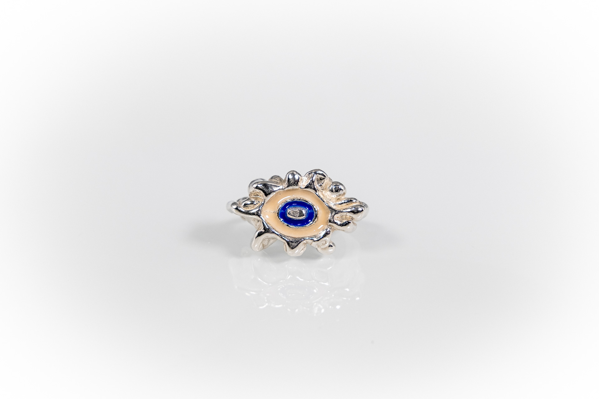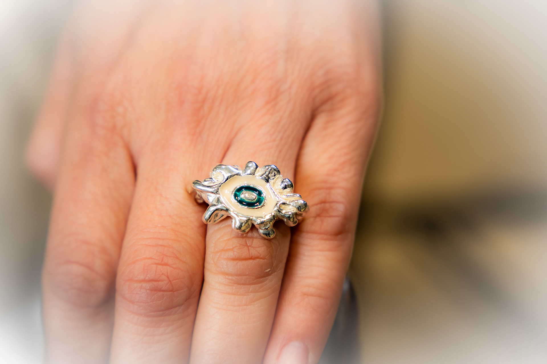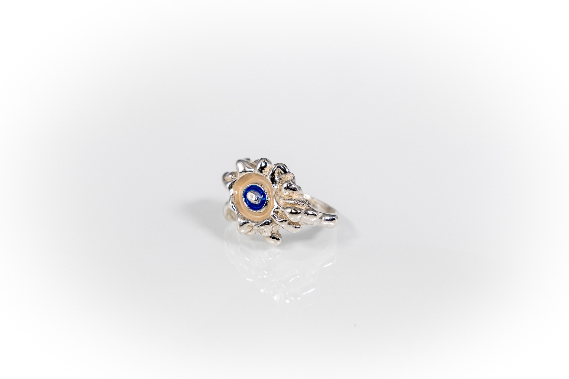 Χειροποίητο δακτυλίδι φτιαγμένο με την τεχνική cera persa / lost wax technique, από ασήμι 925, με χρωματιστή υάλωση σε επιλογμένα χρώματα.