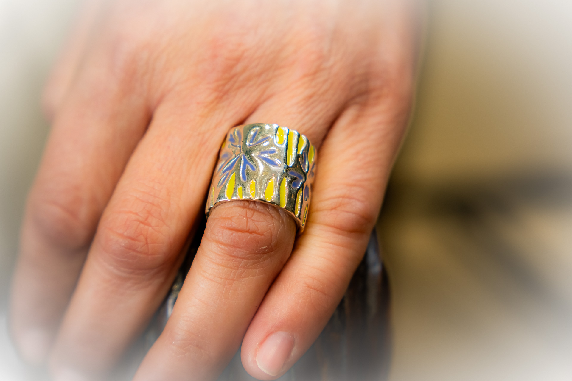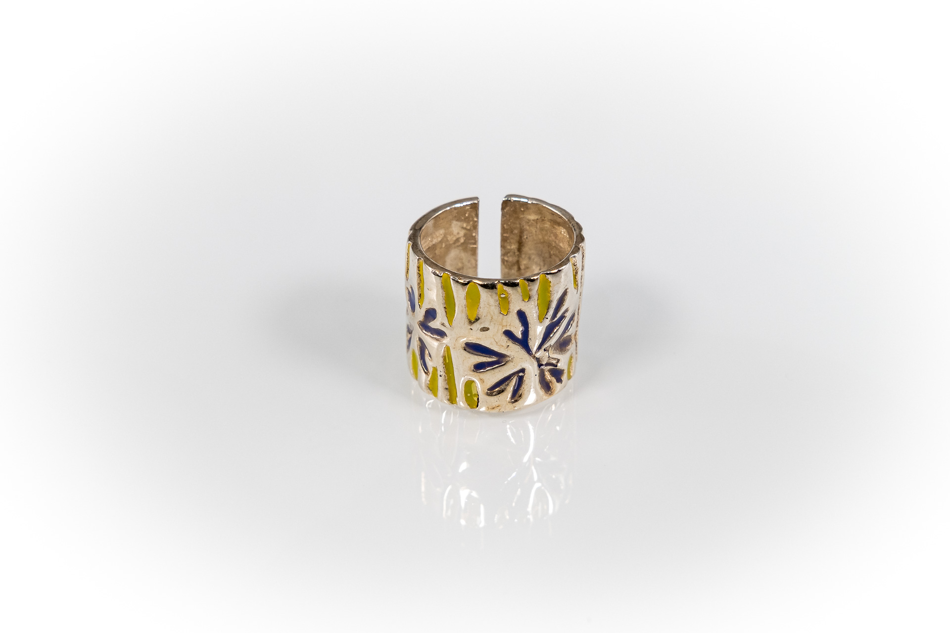 Χειροποίητο δακτυλίδι φτιαγμένο με την τεχνική cera persa / lost wax technique, από ασήμι 925, με χρωματιστή υάλωση και ανοιχτή γάμπα.